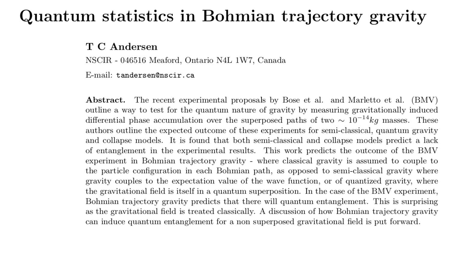 What the paper and poster argue is that in the BMV experiment, observing entanglement is not enough to show that gravity is quantum. I do this by showing that a classical gravitational field coupled to the Bohmian trajectories of the individual particles will show entanglement.