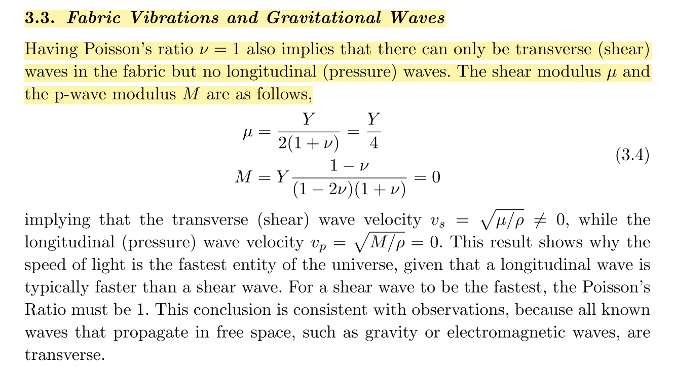 A few problems with this approach – you can see one paper coming up with Young’s modulus varying with frequency (McDonald), and others struggling with how to even support transverse waves in this elastic medium. A key measure of a substance is its Poisson’s ratio – which is an elasticity measure. The semi consensus is that this ratio is 1 for the ether, which is not like any normal material (but OK spacetime is not a normal material!).